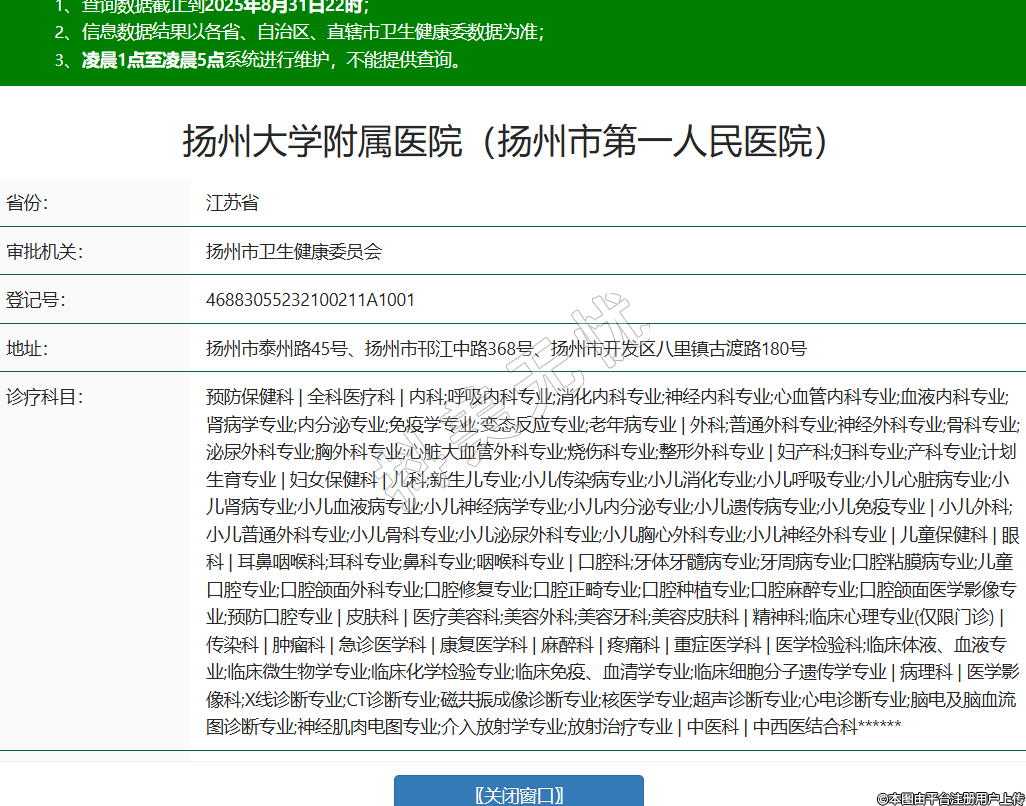 省份:江蘇省審批機關(guān):揚州市衛(wèi)生健康委員會登記號:46883055232100211A1001地址:揚州市泰州路45號、揚州市邗江中路368號、揚州市開發(fā)區(qū)八里鎮(zhèn)古渡路180號診療科目:預(yù)防保健科 | 全科醫(yī)療科 | 內(nèi)科;呼吸內(nèi)科專業(yè);消化內(nèi)科專業(yè);神經(jīng)內(nèi)科專業(yè);心血管內(nèi)科專業(yè);血液內(nèi)科專業(yè);腎病學(xué)專業(yè);內(nèi)分泌專業(yè);免疫學(xué)專業(yè);變態(tài)反應(yīng)專業(yè);老年病專業(yè) | 外科;普通外科專業(yè);神經(jīng)外科專業(yè);骨科專業(yè);泌尿外科專業(yè);胸外科專業(yè);心臟大血管外科專業(yè);燒傷科專業(yè);整形外科專業(yè) | 婦產(chǎn)科;婦科專業(yè);產(chǎn)科專業(yè);計劃生育專業(yè) | 婦女保健科 | 兒科;新生兒專業(yè);小兒傳染病專業(yè);小兒消化專業(yè);小兒呼吸專業(yè);小兒心臟病專業(yè);小兒腎病專業(yè);小兒血液病專業(yè);小兒神經(jīng)病學(xué)專業(yè);小兒內(nèi)分泌專業(yè);小兒遺傳病專業(yè);小兒免疫專業(yè) | 小兒外科;小兒普通外科專業(yè);小兒骨科專業(yè);小兒泌尿外科專業(yè);小兒胸心外科專業(yè);小兒神經(jīng)外科專業(yè) | 兒童保健科 | 眼科 | 耳鼻咽喉科;耳科專業(yè);鼻科專業(yè);咽喉科專業(yè) | 口腔科;牙體牙髓病專業(yè);牙周病專業(yè);口腔粘膜病專業(yè);兒童口腔專業(yè);口腔頜面外科專業(yè);口腔修復(fù)專業(yè);口腔正畸專業(yè);口腔種植專業(yè);口腔麻醉專業(yè);口腔頜面醫(yī)學(xué)影像專業(yè);預(yù)防口腔專業(yè) | 皮膚科 | 醫(yī)療美容科;美容外科;美容牙科;美容皮膚科 | 精神科;臨床心理專業(yè)(僅限門診) | 傳染科 | 腫瘤科 | 急診醫(yī)學(xué)科 | 康復(fù)醫(yī)學(xué)科 | 麻醉科 | 疼痛科 | 重癥醫(yī)學(xué)科 | 醫(yī)學(xué)檢驗科;臨床體液、血液專業(yè);臨床微生物學(xué)專業(yè);臨床化學(xué)檢驗專業(yè);臨床免疫、血清學(xué)專業(yè);臨床細胞分子遺傳學(xué)專業(yè) | 病理科 | 醫(yī)學(xué)影像科;X線診斷專業(yè);CT診斷專業(yè);磁共振成像診斷專業(yè);核醫(yī)學(xué)專業(yè);超聲診斷專業(yè);心電診斷專業(yè);腦電及腦血流圖診斷專業(yè);神經(jīng)肌肉電圖專業(yè);介入放射學(xué)專業(yè);放射治療專業(yè) | 中醫(yī)科 | 中西醫(yī)結(jié)合科******級別:三級法定代表人:龔開政主要負責(zé)人:龔開政執(zhí)業(yè)許可證有效期:2025/08/26 -至- 2036/01/24 -