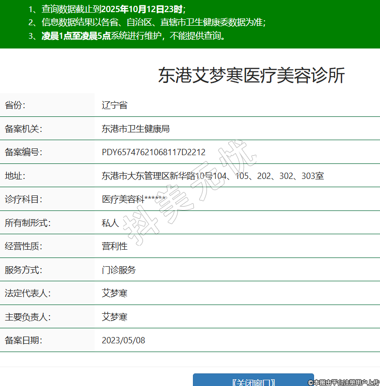 省份:遼寧省備案機關(guān):東港市衛(wèi)生健康局備案編號:PDY65747621068117D2212地址:東港市大東管理區(qū)新華路10號104、105、202、302、303室診療科目:醫(yī)療美容科******所有制形式:私人經(jīng)營性質(zhì):營利性服務(wù)方式:門診服務(wù)法定代表人:艾夢寒主要負責(zé)人:艾夢寒備案日期:2023/05/08 -