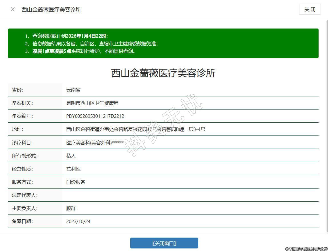 西山金薔薇醫(yī)療美容診所成立于2005年,位于昆明市西山區(qū)金碧街道辦事處金碧路復興花園17號金碧馨園D幢一層3-4號,是合規(guī)經營的專業(yè)醫(yī)美機構,組建具備正規(guī)資質的醫(yī)師團隊,所有醫(yī)師均通過相關專業(yè)認證,實操經驗豐富,診療范圍涵蓋皮膚護理、抗衰保養(yǎng)、輪廓塑形等合規(guī)醫(yī)美項目。