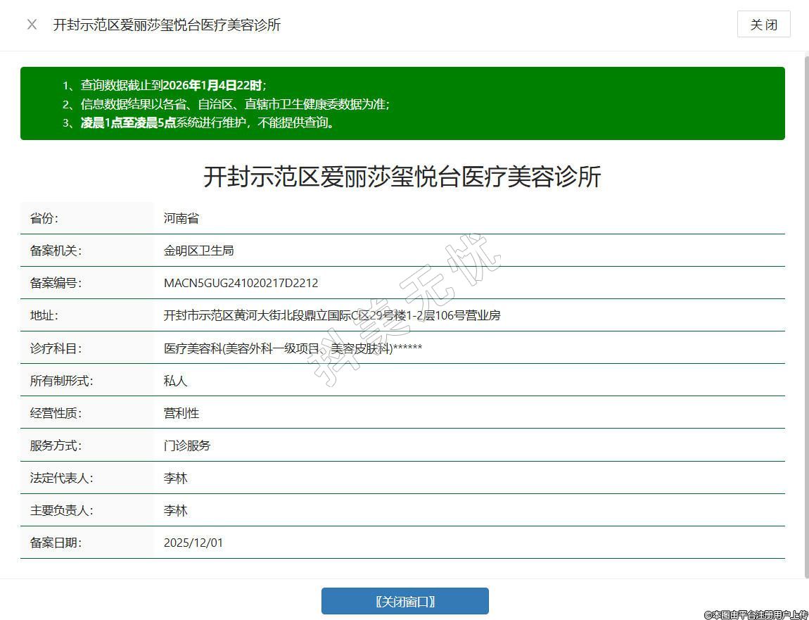 開(kāi)封愛(ài)麗莎璽悅臺(tái)醫(yī)療美容診所成立于2023年,位于河南省開(kāi)封市示范區(qū)黃河大街北段鼎立國(guó)際C區(qū)29號(hào)樓1-2層106號(hào)營(yíng)業(yè)房,是經(jīng)衛(wèi)生部門審核批準(zhǔn)、持有《醫(yī)療機(jī)構(gòu)執(zhí)業(yè)許可證》的正規(guī)醫(yī)療美容機(jī)構(gòu),業(yè)務(wù)范圍涵蓋醫(yī)療美容服務(wù)、生活美容服務(wù)等許可項(xiàng)目,提供眼部整形、鼻部整形、面部抗衰、皮膚護(hù)理等多樣化診療服務(wù),全程落實(shí)術(shù)前知情告知與術(shù)后跟蹤護(hù)理制度水滴信用。