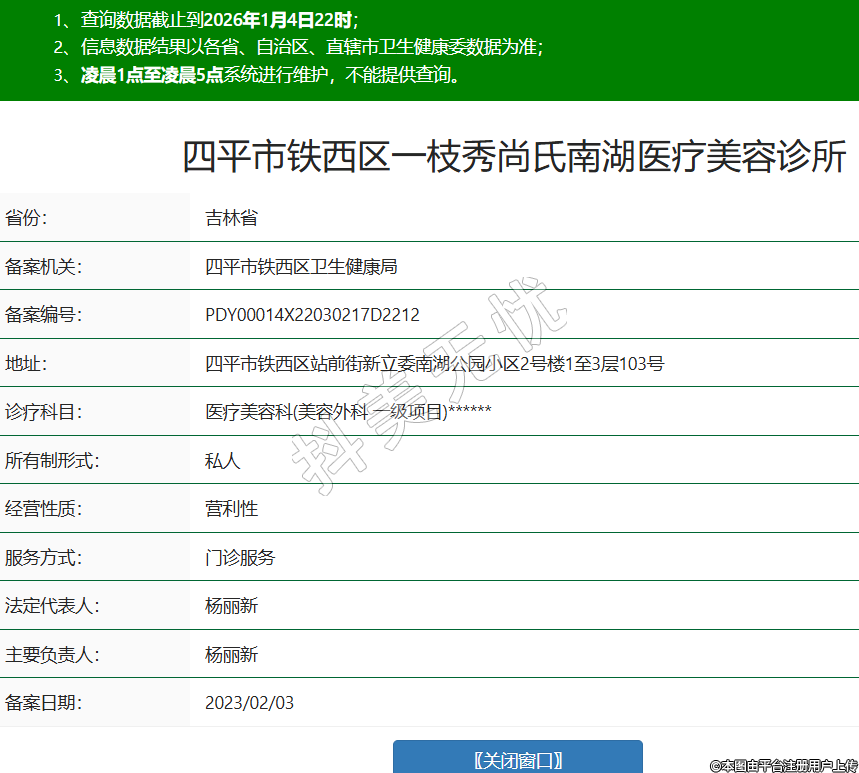 省份:吉林省備案機(jī)關(guān):四平市鐵西區(qū)衛(wèi)生健康局備案編號:PDY00014X22030217D2212地址:四平市鐵西區(qū)站前街新立委南湖公園小區(qū)2號樓1至3層103號診療科目:醫(yī)療美容科(美容外科 一級項(xiàng)目)******所有制形式:私人經(jīng)營性質(zhì):營利性服務(wù)方式:門診服務(wù)法定代表人:楊麗新主要負(fù)責(zé)人:楊麗新備案日期:2023/02/03 -