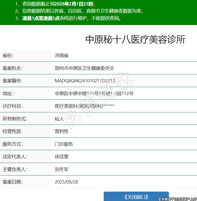 省份:河南省備案機(jī)關(guān):鄭州市中原區(qū)衛(wèi)生健康委員會(huì)備案編號(hào):MADQXQAK241010217D2212地址:中原區(qū)中原中路171號(hào)1號(hào)樓1-2層112號(hào)診療科目:醫(yī)療美容科(美容皮膚科)******所有制形式:私人經(jīng)營(yíng)性質(zhì):營(yíng)利性服務(wù)方式:門(mén)診服務(wù)法定代表人:徐佳雯主要負(fù)責(zé)人:劉冬軍備案日期:2025/09/28 -