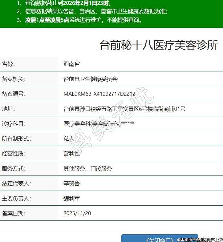 省份:河南省備案機(jī)關(guān):臺(tái)前縣衛(wèi)生健康委員會(huì)備案編號(hào):MAE0KM6B-X41092717D2212地址:臺(tái)前縣孫口鎮(zhèn)經(jīng)五路王黑安置區(qū)6號(hào)樓臨街商鋪01號(hào)診療科目:醫(yī)療美容科(美容皮膚科)******所有制形式:私人經(jīng)營性質(zhì):營利性服務(wù)方式:其他服務(wù)、門診服務(wù)法定代表人:辛賀魯主要負(fù)責(zé)人:魏利軍備案日期:2025/11/20 -