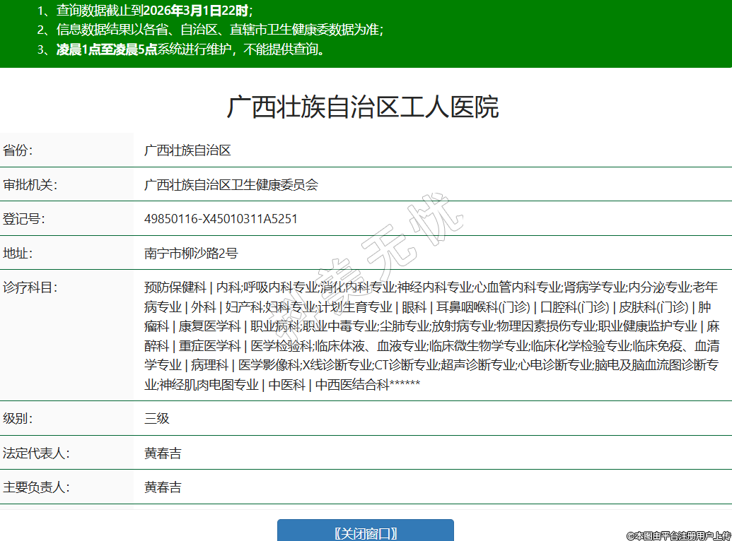 省份:廣西壯族自治區(qū)審批機關:廣西壯族自治區(qū)衛(wèi)生健康委員會登記號:49850116-X45010311A5251地址:南寧市柳沙路2號診療科目:預防保健科 | 內科;呼吸內科專業(yè);消化內科專業(yè);神經內科專業(yè);心血管內科專業(yè);腎病學專業(yè);內分泌專業(yè);老年病專業(yè) | 外科 | 婦產科;婦科專業(yè);計劃生育專業(yè) | 眼科 | 耳鼻咽喉科(門診) | 口腔科(門診) | 皮膚科(門診) | 腫瘤科 | 康復醫(yī)學科 | 職業(yè)病科;職業(yè)中毒專業(yè);塵肺專業(yè);放射病專業(yè);物理因素損傷專業(yè);職業(yè)健康監(jiān)護專業(yè) | 麻醉科 | 重癥醫(yī)學科 | 醫(yī)學檢驗科;臨床體液、血液專業(yè);臨床微生物學專業(yè);臨床化學檢驗專業(yè);臨床免疫、血清學專業(yè) | 病理科 | 醫(yī)學影像科;X線診斷專業(yè);CT診斷專業(yè);超聲診斷專業(yè);心電診斷專業(yè);腦電及腦血流圖診斷專業(yè);神經肌肉電圖專業(yè) | 中醫(yī)科 | 中西醫(yī)結合科******級別:三級法定代表人:黃春吉主要負責人:黃春吉執(zhí)業(yè)許可證有效期:2016/08/11 -至- 2031/08/10 -