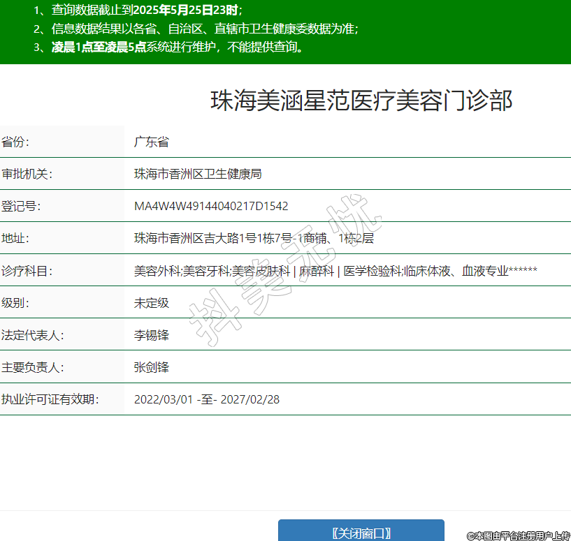 省份:廣東省審批機(jī)關(guān):珠海市香洲區(qū)衛(wèi)生健康局登記號(hào):MA4W4W49144040217D1542地址:珠海市香洲區(qū)吉大路1號(hào)1棟7號(hào)-1商鋪、1棟2層診療科目:美容外科;美容牙科;美容皮膚科 | 麻醉科 | 醫(yī)學(xué)檢驗(yàn)科;臨床體液、血液專業(yè)******級(jí)別:未定級(jí)法定代表人:李錫鋒主要負(fù)責(zé)人:張劍鋒執(zhí)業(yè)許可證有效期:2022/03/01 -至- 2027/02/28 -