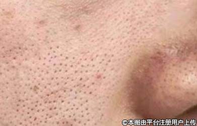肌膚像風(fēng)干的橘子皮,毛孔粗大出現(xiàn)在鼻翼兩側(cè)等臉頰部位,毛孔呈橢圓形。
