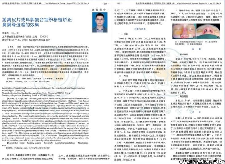 在2023年8月中旬,上海聯(lián)合麗格范榮杰院長(zhǎng)發(fā)表了題為《游離皮片或耳廓復(fù)合組織移植矯正鼻翼緣退縮的效果》的論文被中國(guó)臨床案例成果數(shù)據(jù)庫 (CMCR)收錄并頒發(fā)了收錄證書。