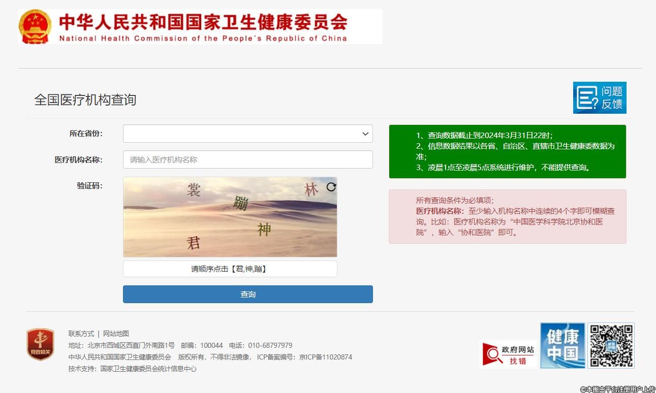【快捷方法】點擊網(wǎng)址進(jìn)入國家衛(wèi)健委官網(wǎng)(全國醫(yī)療機(jī)構(gòu)查詢):http://zgcx.nhc.gov.cn:9090/unit/index
