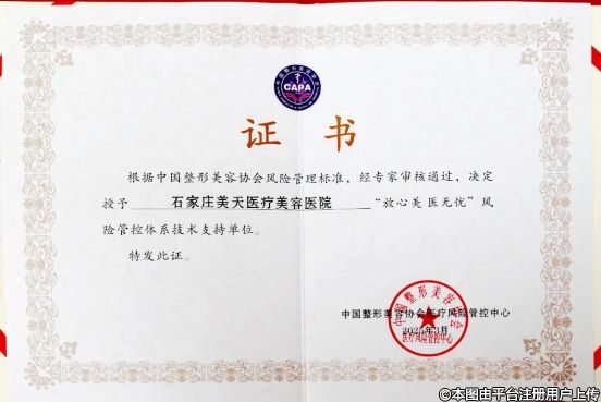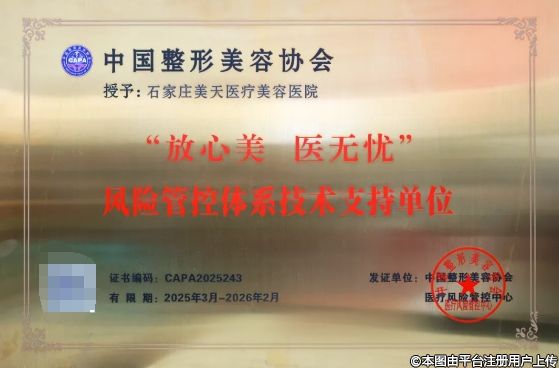 2025年3月,根據(jù)中國整形美容協(xié)會(huì)風(fēng)險(xiǎn)管理標(biāo)準(zhǔn),經(jīng)專家審核通過,石家莊美天醫(yī)療美容醫(yī)院被授予“放心美 醫(yī)無憂”風(fēng)險(xiǎn)管控體系技術(shù)支持單位。中國整形美容協(xié)會(huì)醫(yī)療風(fēng)險(xiǎn)管控中心為石家莊美天發(fā)放證書。