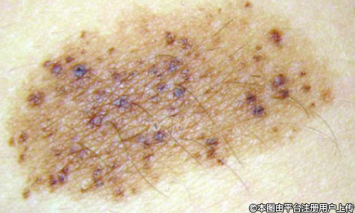 背景斑邊界清楚,上面的深色小點(diǎn)可以是各種痣,如交界痣、復(fù)合痣、皮內(nèi)痣、藍(lán)痣、日光性雀斑樣痣或先天性色素痣。
